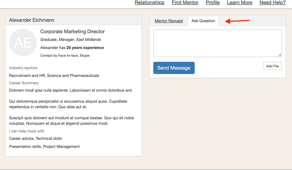 Once you have identified a potentially suitable mentor you can use the Ask A Question feature to contact the mentor prior to sending a mentoring request to ask any additional questions you may have that would help you decide if this is the right mentor for you.