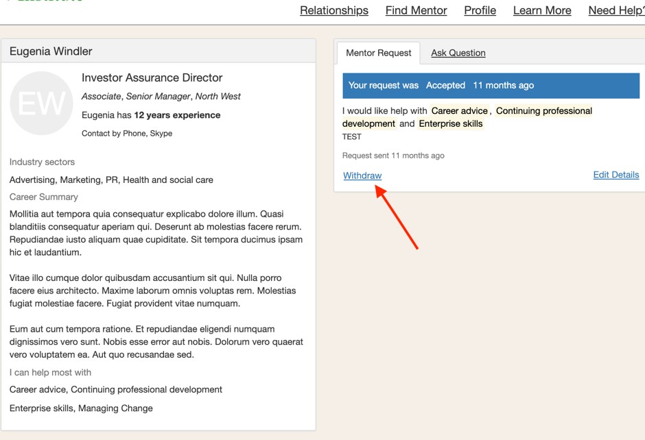 However, if at any point you change your mind and no longer wish to start or continue your mentoring journey do please let your mentor/mentee know by withdrawing from the mentoring relationship.