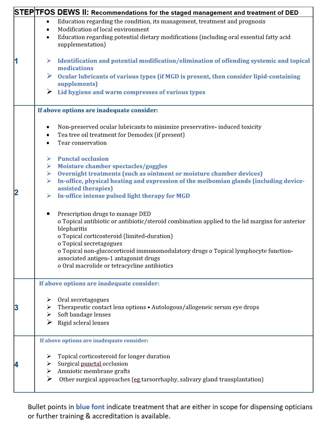 Figure 49 below lists the recommended staged management process for treating DED, the majority of patients we are likely to see will be covered in step one.