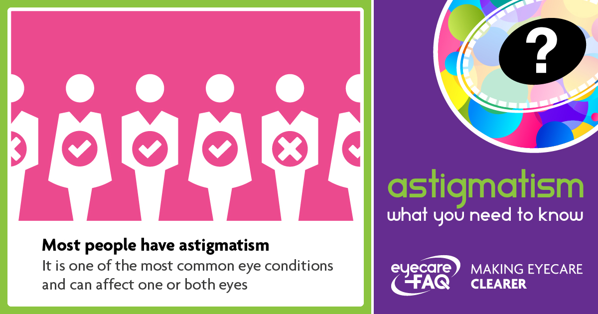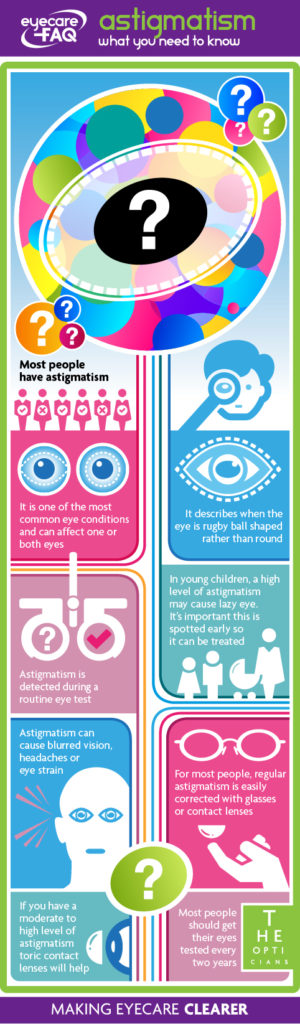 Astigmatism is very common and generally nothing to worry about. It describes when the eye is rugby ball shaped rather than round. The majority of people have a small degree of astigmatism which causes no problems. If you wear glasses, you can be long or short sighted and also have astigmatism. The astigmatism will be taken into account in your spectacle prescription. A higher degree of astigmatism can cause blurred vision and you will need to wear glasses to correct it. It can occur in one or both eyes.