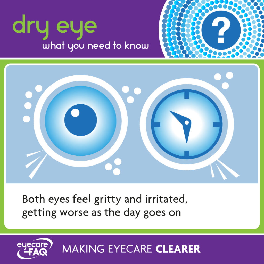 If your eyes both become irritated as the day goes on, and this happens every day, you may have dry eyes. You may feel that your eyes are simply irritated or that they burn. Some people find their eyes are gritty on waking. Surprisingly, people with dry eye may find their eyes water as the eye tries to relieve irritation by increasing the production of tears. Your vision may be normal, or it may become blurry as the day goes on but clear on blinking. If you think you may have dry eye book as assessment with your optician. Some opticians specialise in treating dry eye.