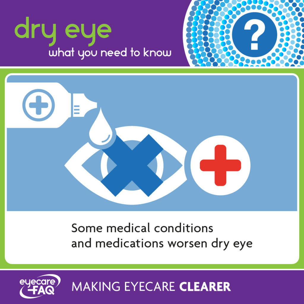 Medical conditions that can increase your risk of dry eye include allergic conjunctivitis, contact dermatitis, Sjögren’s syndrome, rheumatoid arthritis, lupus, scleroderma, Bell’s palsy and HIV. If you have one of these problems talk to your consultant about any eye irritation.