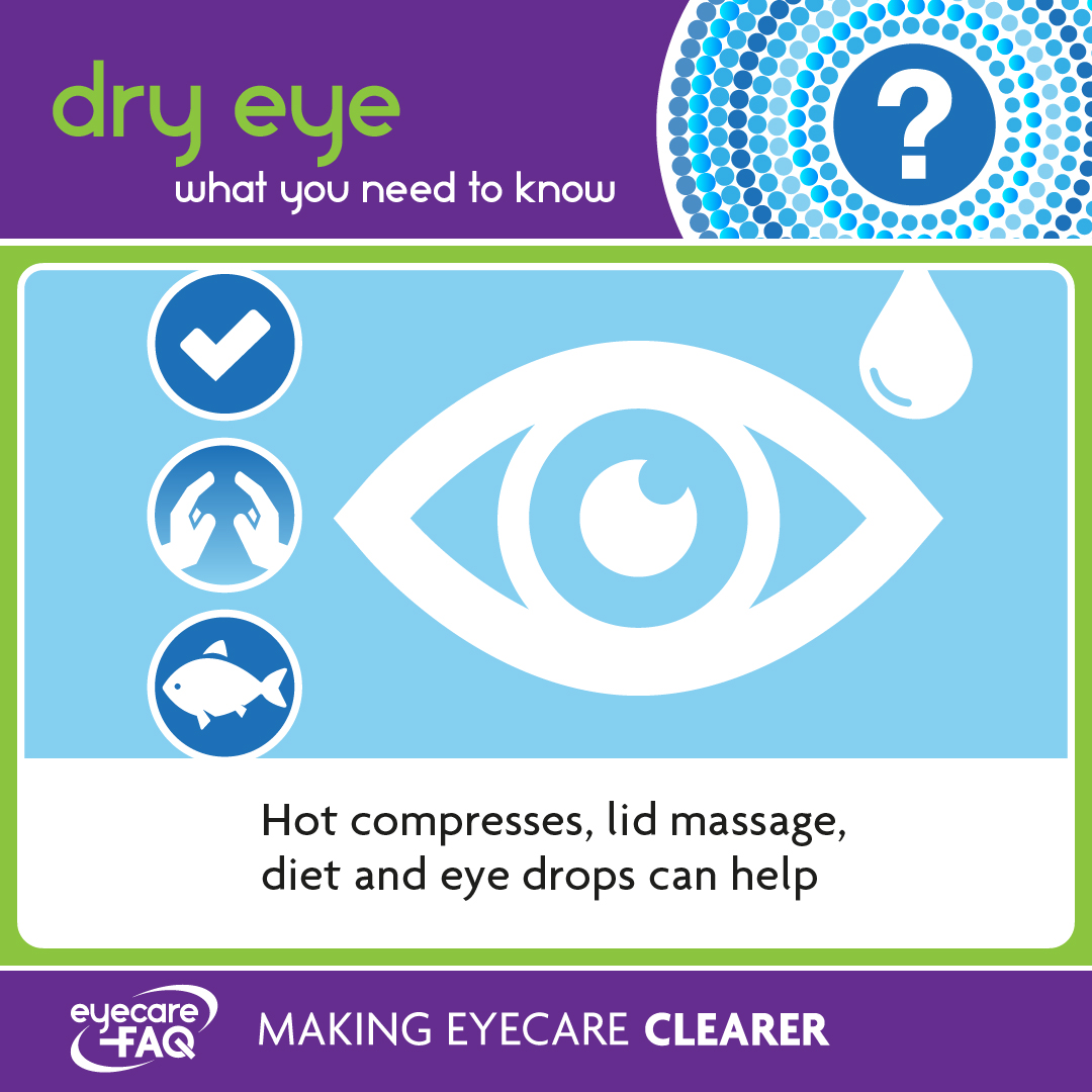 Keeping your lids clean can help with dry and irritated eyes. Every morning and night, use a warm compress on your eyes. Holding this in place for a few minutes will improve the production and flow of oil from the glands in your lid. Gentle lid massage with a clean cotton wool bud will help the oils flow too. Then use special wipes or cotton wool and cooled boiled water to clean the edges of your lids and your lashes. Talk to your optician about whether lid hygiene might help you.