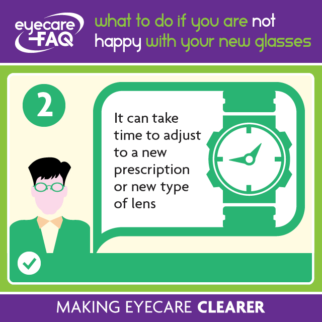 Sometimes it can take a few days to get used to new glasses. This is particularly the case if you have had a big change in prescription or if you have switched to a new type of lens. Try your specs out for a few days at home. If you need more advice, go back to the optical practice that dispensed the spectacles. Ask to speak to the registered dispensing optician who can advise you and help resolve any problems.