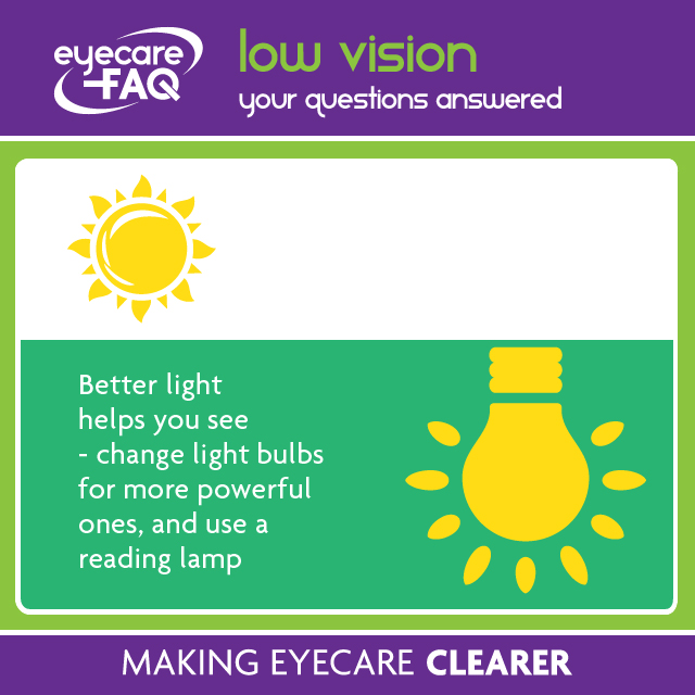 If you find something hard to see, better light will always help. Try changing light bulbs for more powerful one. Try and have the light close to what you want to see, the closer the light is the brighter it will appear and will improve the vision. Having an extra reading lamp that can shine over your shoulder when you look at a book is a great example. Look at the places where you find things difficult to see and think about whether you could add in extra light.