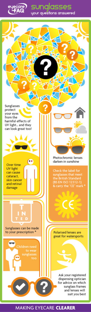 Sunglasses need to fit your face well in order to be effective at stopping UV light, so make sure that you get advice when choosing. Always look for the CE mark when buying lenses. Speak to a registered dispensing optician for advice on prescription sunglasses and fitting.