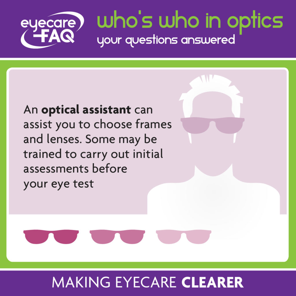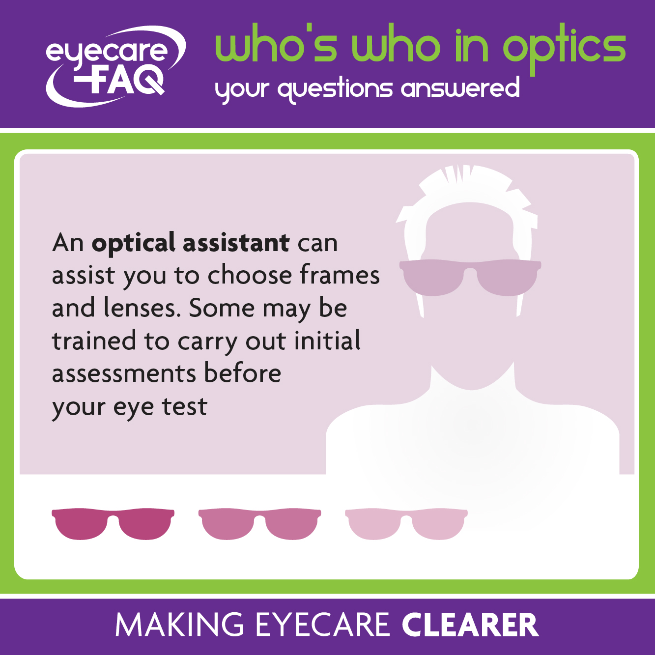 An optical assistant works under supervision in an optical practice to assist people with choosing frames and lenses. Some optical assistants also have training to allow them to carry out initial assessments before an eye examination such as autorefraction.
