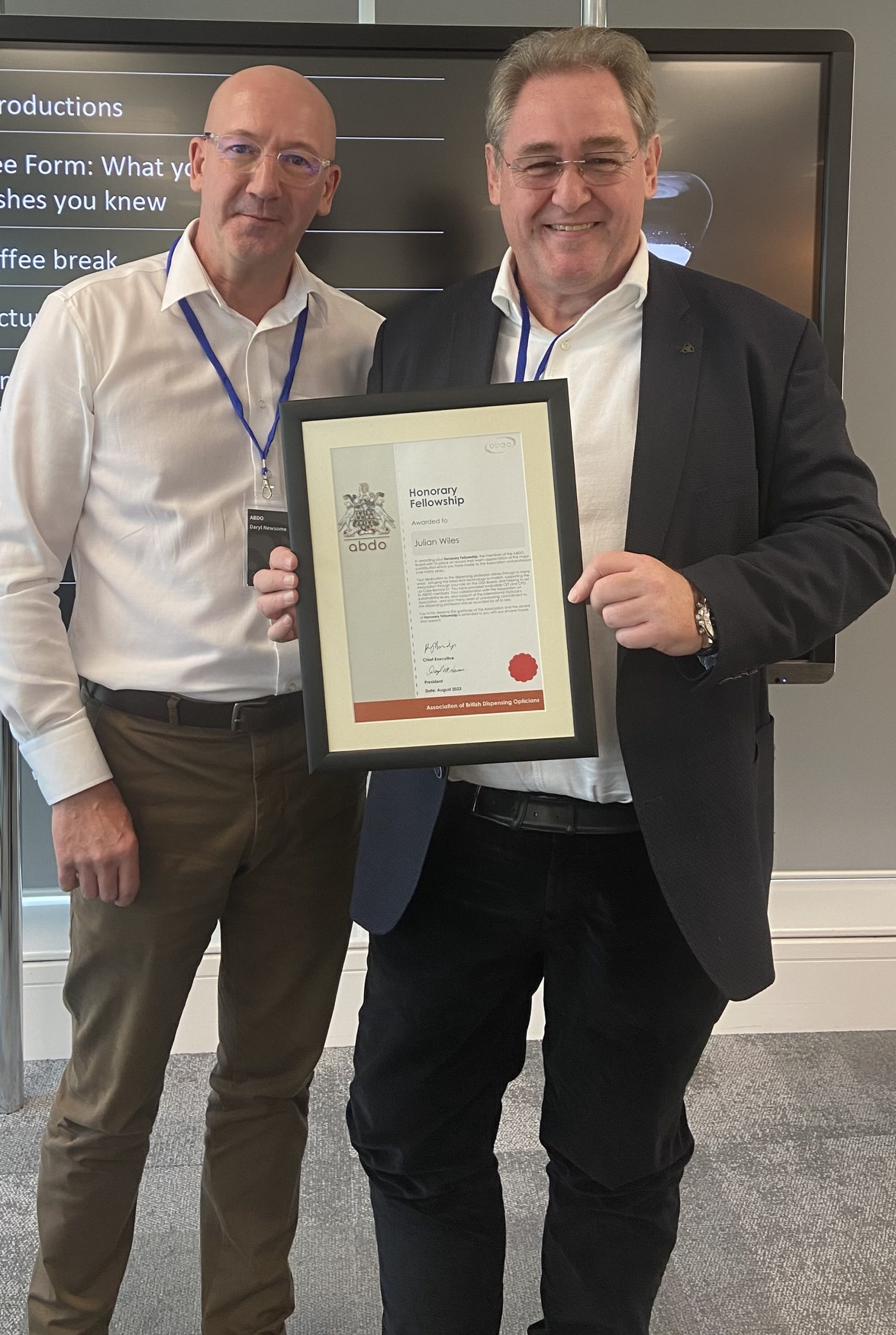 Julian, who is founder and owner Performance Lenses and Younger Optics country manager for the UK and Ireland. was also cited for his contribution to “invaluable CET and CPD to ABDO members”, his collaboration with the Association on sustainability issues, support of the International Opticians Association, and his “many years of unwavering commitment to the dispensing profession”.