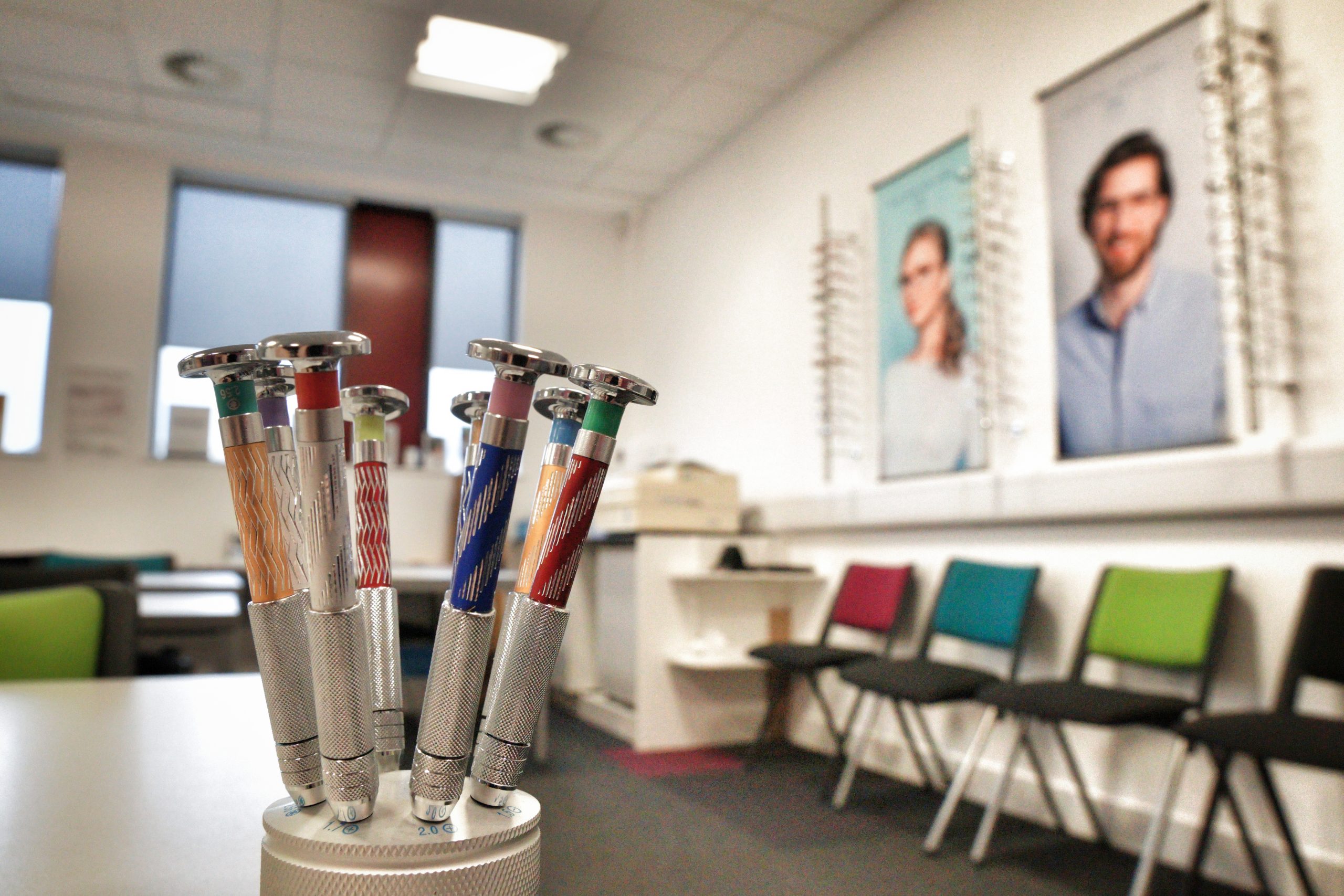 The new virtual practice doubles up as a classroom, but has the atmosphere of a working practice setting with frame bars, marketing posters, patient leaflets, lens demonstration kits, glazing and dispensing equipment, focimeters – all contributing to the overall feel of a working practice. The room is complete with a reception desk, waiting area and even a couple of plants.