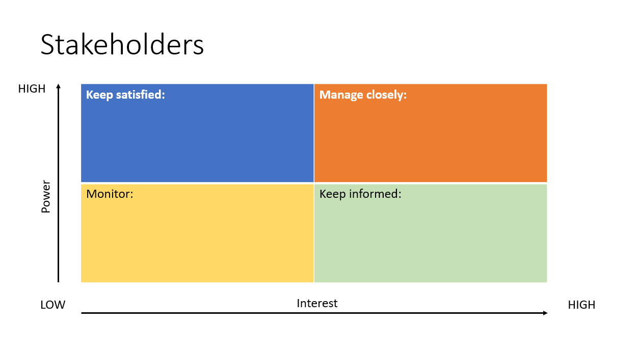 Using a stakeholder matrix (as shown below) helps you to arrange each stakeholder according to their power (influence) and interest. This will help to determine what actions you need to take to keep the relationships on the right footing, including:
