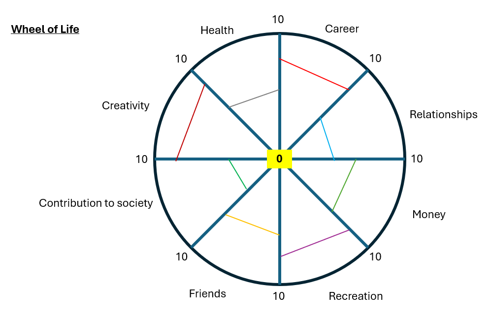 The Wheel of Life is a tool to help you visualise the important areas of your life all at once. The wheel helps you to better understand which important areas are thriving, and which are being neglected and need the most work.
