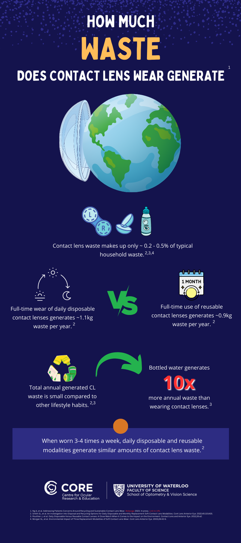 In a bylined article published earlier this month in the UK, CORE lead clinical scientist, Alison Ng, and CORE director Lyndon Jones acknowledge that “most major contact lens manufacturers have demonstrated an ongoing commitment to sustainable practices” by preventing waste as well as encouraging reuse, recycling, recovery and responsible disposal.