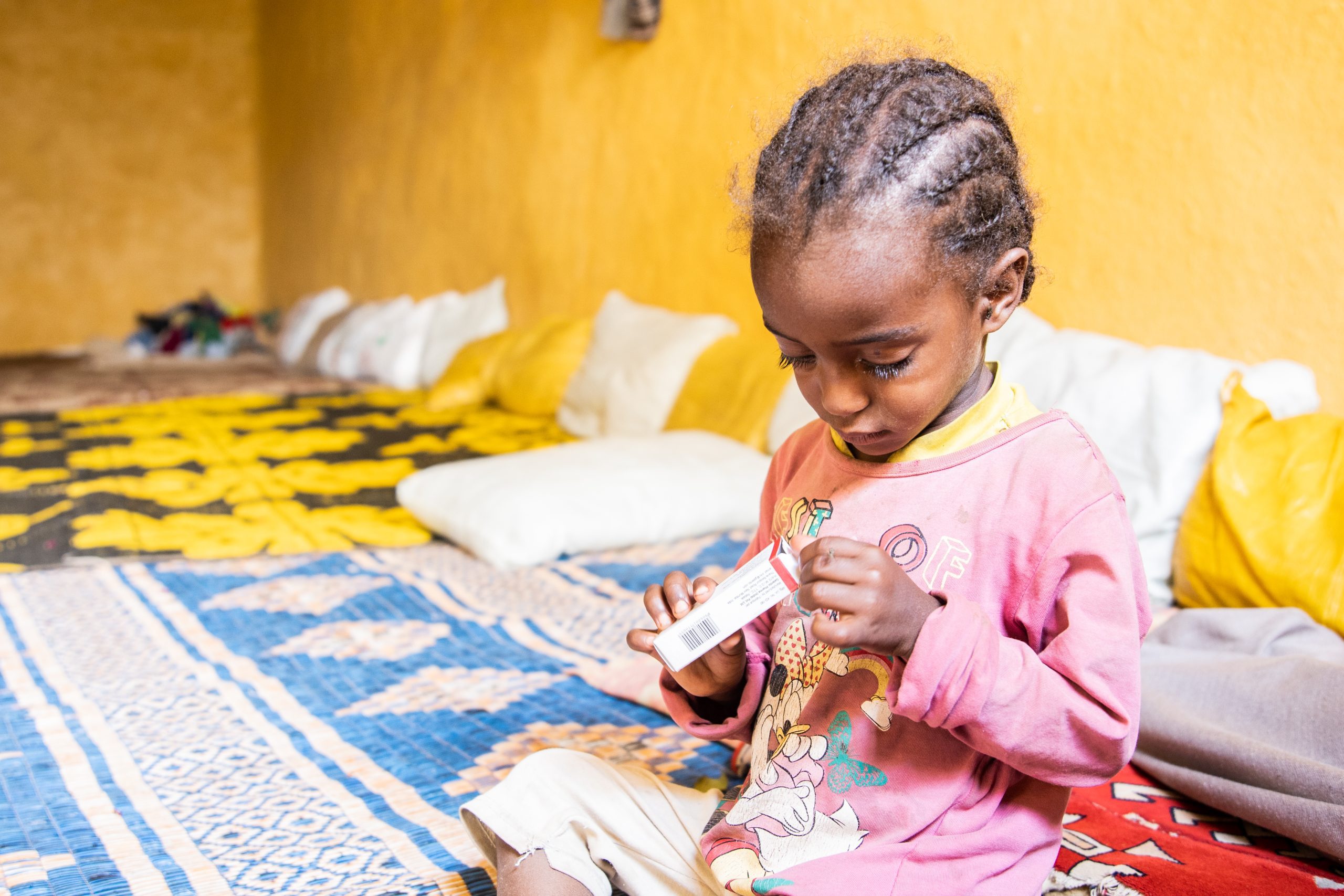 Three-year-old Neima inspects her antibiotics In Ethiopia 2023