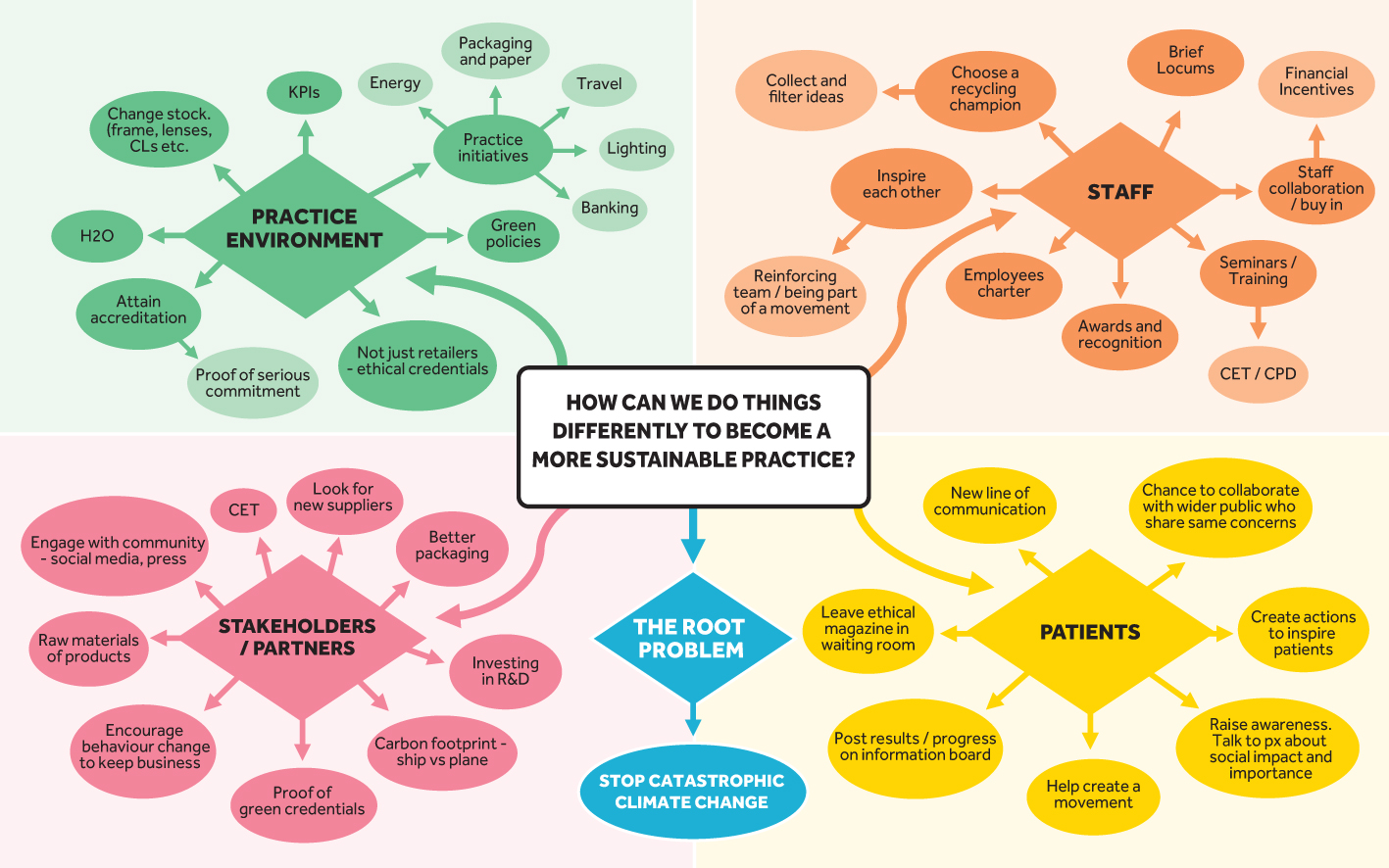 In addition to these assessments, it was deemed judicious to research opinions and guidance from optical bodies on the subject of sustainability. Chris found the most helpful of these to be the ABDO website with details of their SEE Summit and the #thinkinggreen initiative. As a result of further exploration on the ABDO website, it was possible to look at a number of case studies from other practitioners who had decided to add sustainability actions to their business profile, and to learn from their experiences.