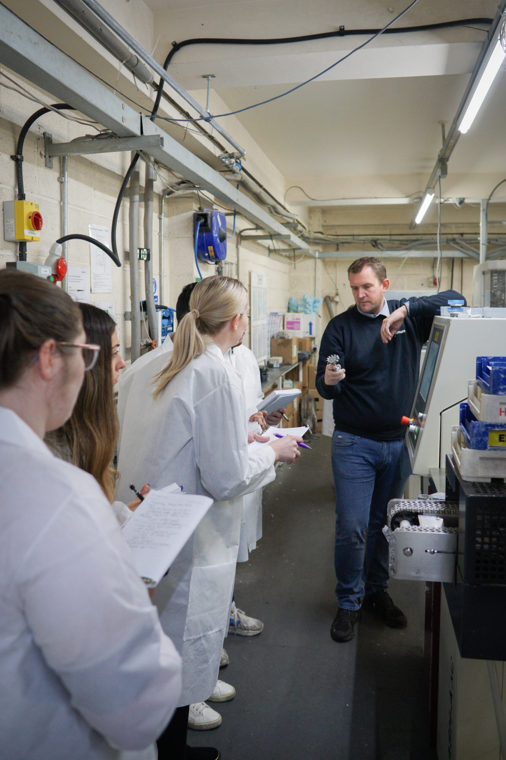 Students were broken into four groups, customer service, surfacing, coatings, tinting and glazing. Each group of students was led by staff members of optimum who had considerable experience within ophthalmic lens manufacturing. All staff members provided an insightful explanation of the various processes throughout the facility, which began with placing semi-finished lenses into a job tray and ended with a packaged job which had been approved via the quality assurance process. Furthermore, they highlighted to students the potential issues that may occur during the manufacturing process to further reinforce why the process is rationalised.