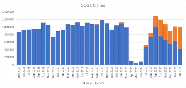 “On 4 March, NHS England told us no further financial support will be made available to practices at present. It gave two reasons for this. One is that its monthly GOS claims data [pictured] is showing relatively stable activity in January and February 2021. The other is that the additional support offered in autumn 2020 to some fixed practices in areas of deprivation was taken up by fewer than 200 practices, suggesting limited demand for further help.