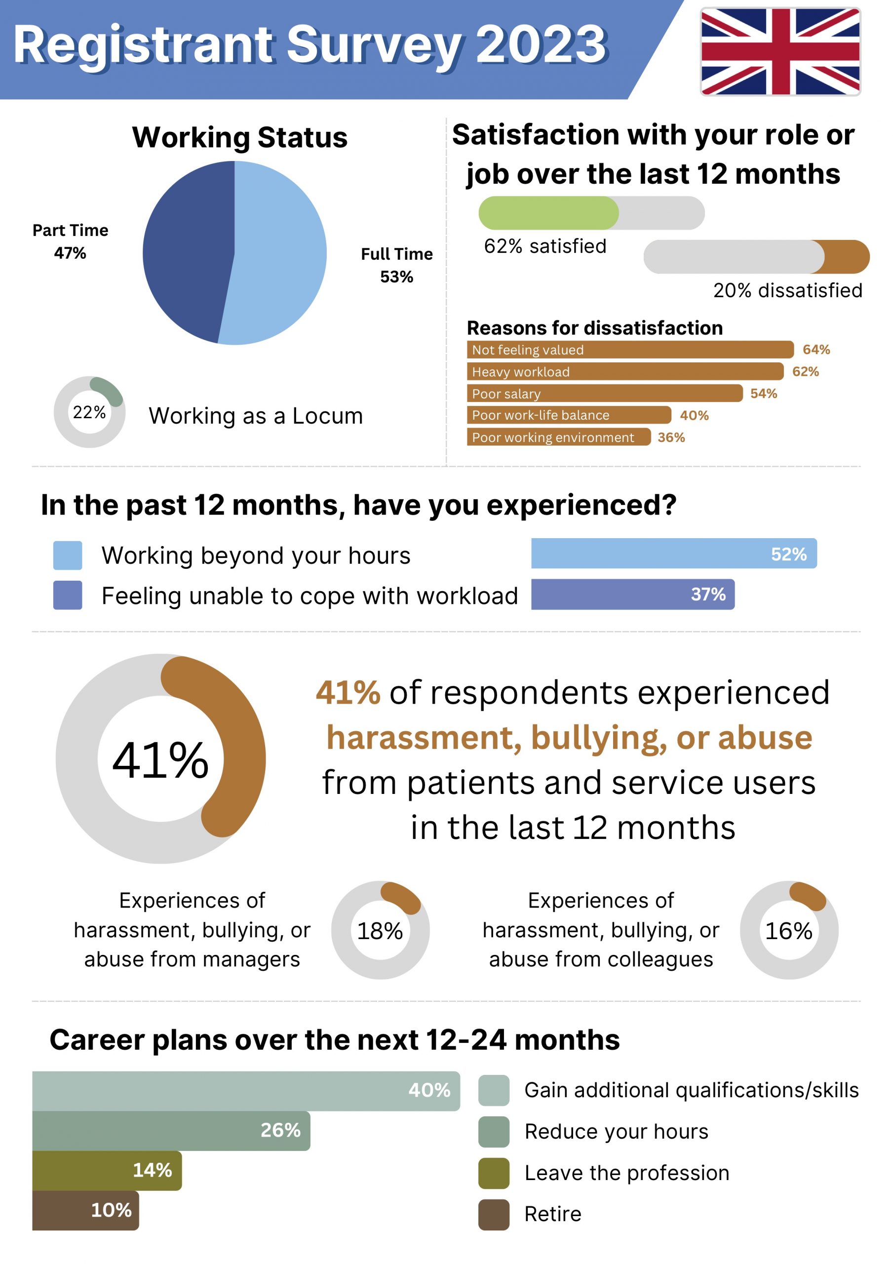 The main reasons for dissatisfaction were not feeling valued, heavy workloads, and poor salaries. Workload pressures remain significant. Fifty-two per cent of respondents reported working beyond their hours and 37 per cent felt unable to cope with their workload. These results are lower than in the 2022 survey (57 and 41 per centrespectively), but similar to the 2021 findings.