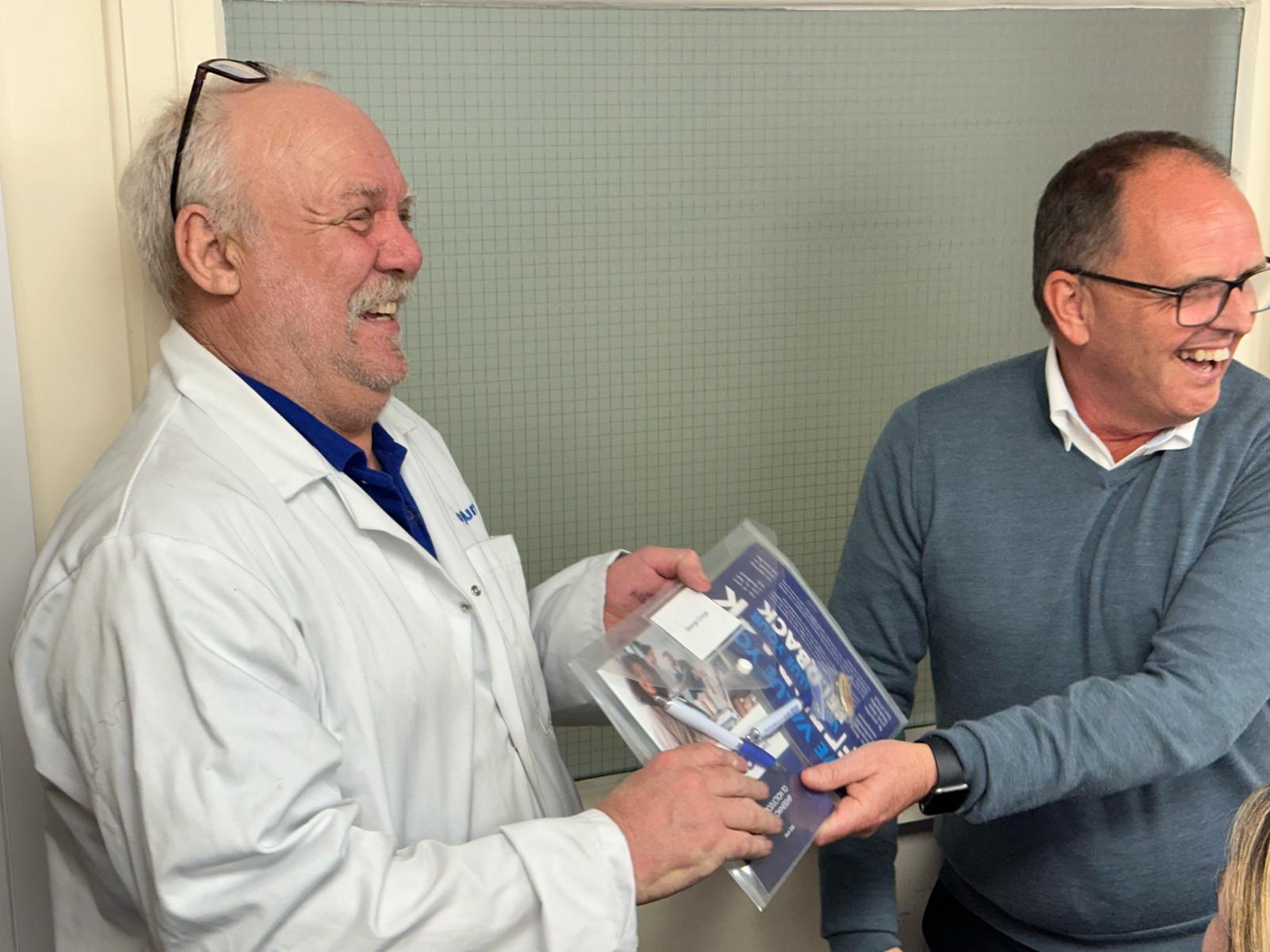 Paul Bailey presents a team member with their ownership pack