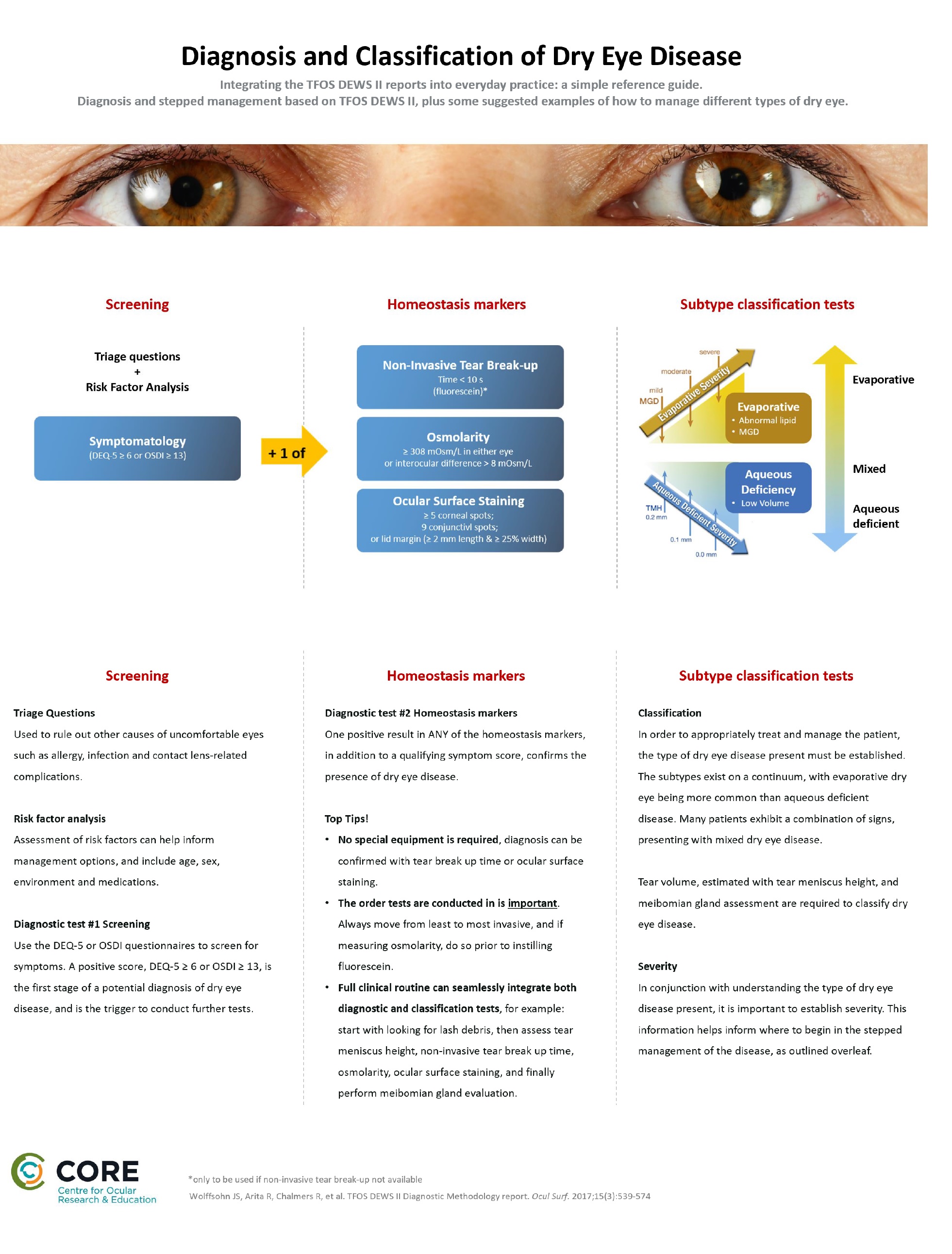 Key observations from the speakers are summarised in the editorial of the special edition along with a downloadable summary of the TFOS DEWS II diagnostic and treatment algorithms designed by CORE. The conference highlights section covers how to take steps to start or expand a dry eye practice. Nutrition and supplementation as they relate to dry eye are reviewed in the feature article, and a clinical insight focuses on the use of symptom questionnaires.