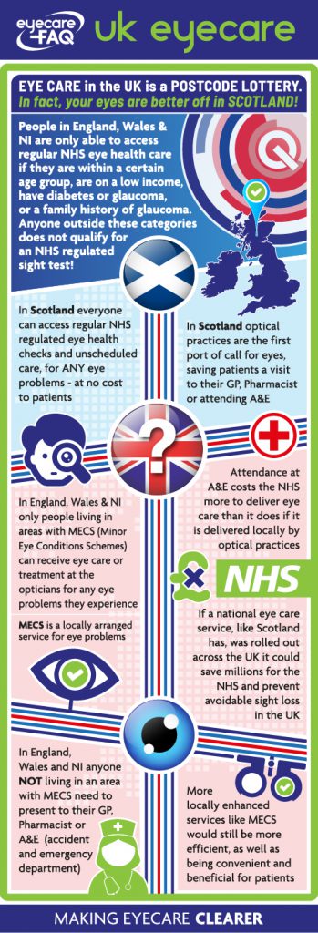 Only people living in areas, with Minor Eye Conditions Schemes (MECS – a locally arranged service for eye problems) in England, Wales and NI can receive eye care/treatment for any eye problems they experience. Anyone not living in an area with MECS need to present to their GP, Pharmacist or A&E which can sometimes lead to misdiagnosis depending on the health care professional they see, if they do not get attended to by a dispensing optician, optometrist or ophthalmologist who are the experts in eye care.