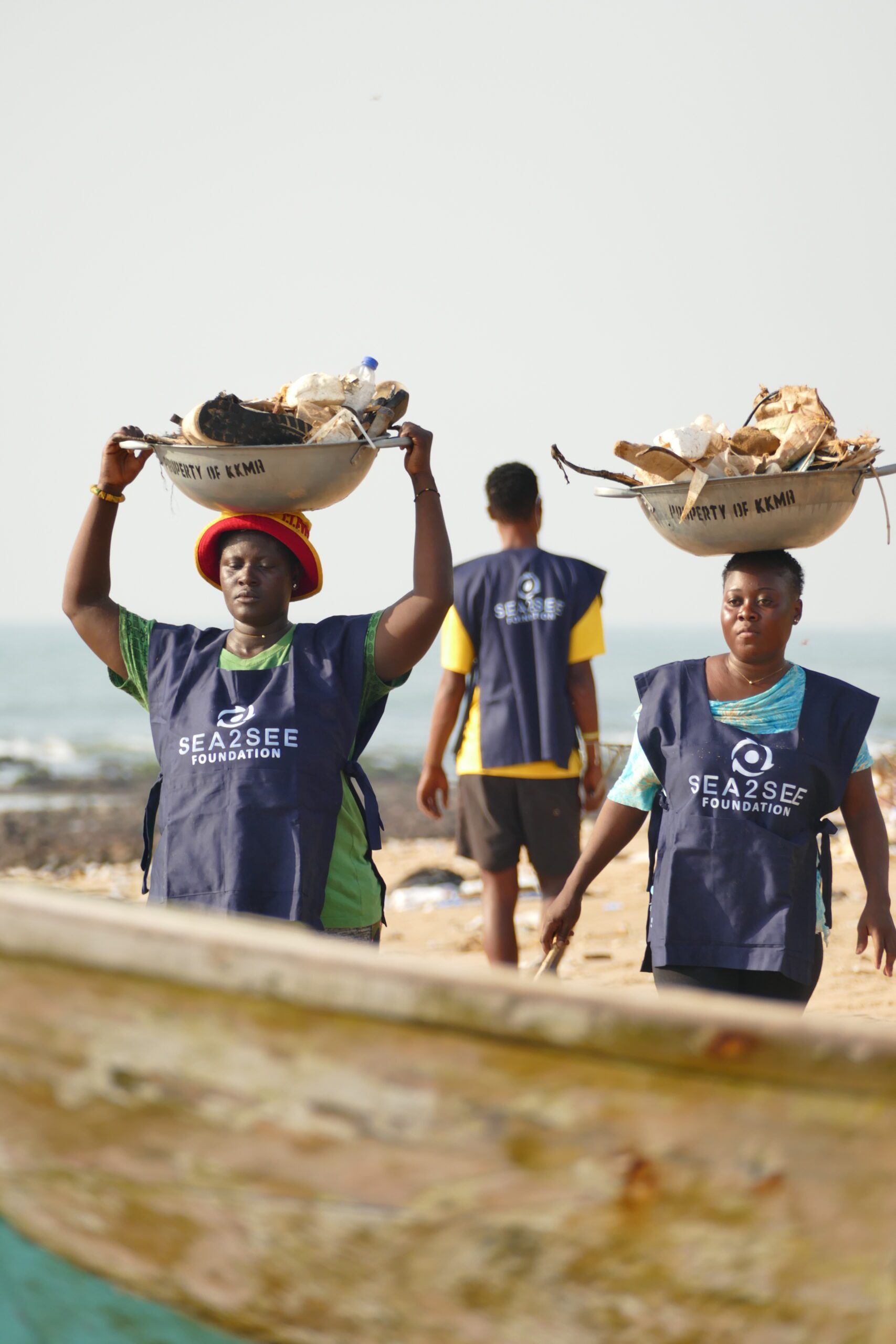 The Foundation is operating in Ghana where marine plastic pollution still needs to be radically reduced. The initial clean-up programme by the foundation has concentrated on waste management and the removal of marine waste from beaches, lakes and rivers and involves local men and women who receive a new source of income for the work. The foundation has established 20 sites for waste collection, with optimised logistics, putting in place 20 reps who are employed to manage and run the Sea2see project across the country. An initiative via the local radio advises locals where they can leave waste and old fishing nets, and arranges for them to bring their bags to be sold – a Sea2see agent will control and weigh the waste and pay them.