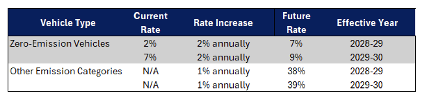 The company car tax rate for zero-emission vehicles will increase gradually in the coming years as follows.